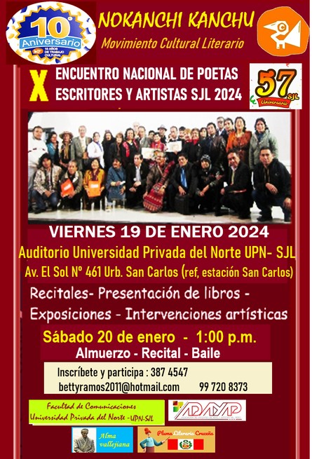 El viernes 19 de enero se realizará el X Encuentro Nacional de Poetas, Escritores y Artistas SJL 2024, organizado por el Movimiento Cultural Literario Nokanchi Kanchu. Esta cita con el ...