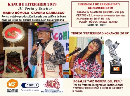 EL Movimiento Cultural Literario Nokanchi Kanchu, otorgará "El Kanchu Literario 2019" al poeta y escritor MARIO RÓMULO CAVERO CARRASCO, en reconocimiento a su producción literaria de contenido profundamente humanista y ...
