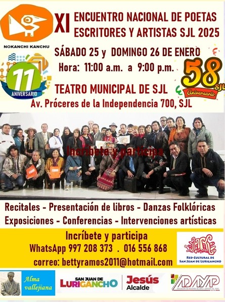 El Movimiento Cultural Literario Nokanchi Kanchu (nosotros somos) está de aniversario, 11 años de actividad cultural y lo celebra organizando el XI ENCUENTRO NACIONAL DE POETAS, ESCRITORES Y ARTISTAS SJL ...